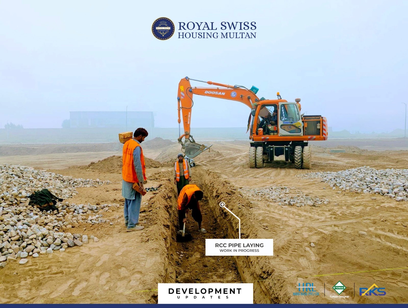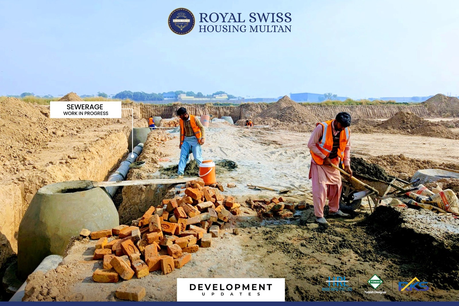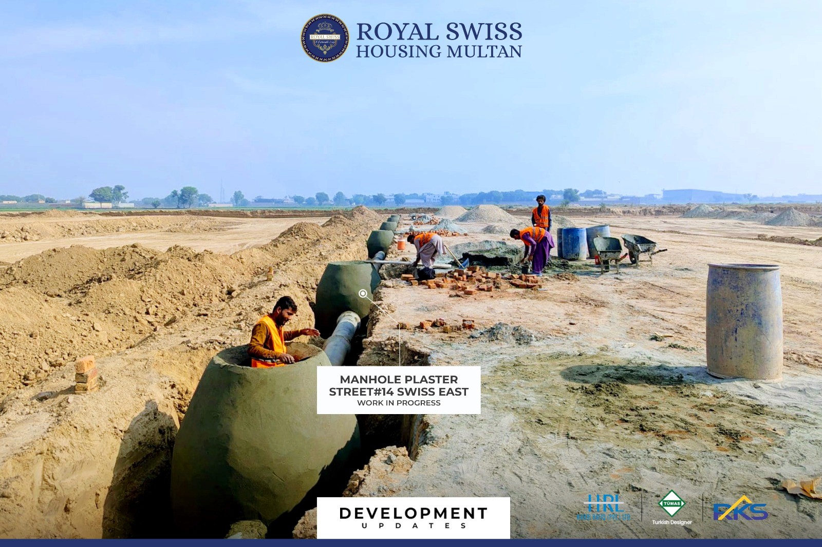 Manhole plastering, sewerage works, and RCC pipe laying are actively in progress across designated streets, strengthening the underground utility network. These works ensure efficient wastewater management and form a critical component of Royal Swiss Housing Multan’s sustainable infrastructure framework.