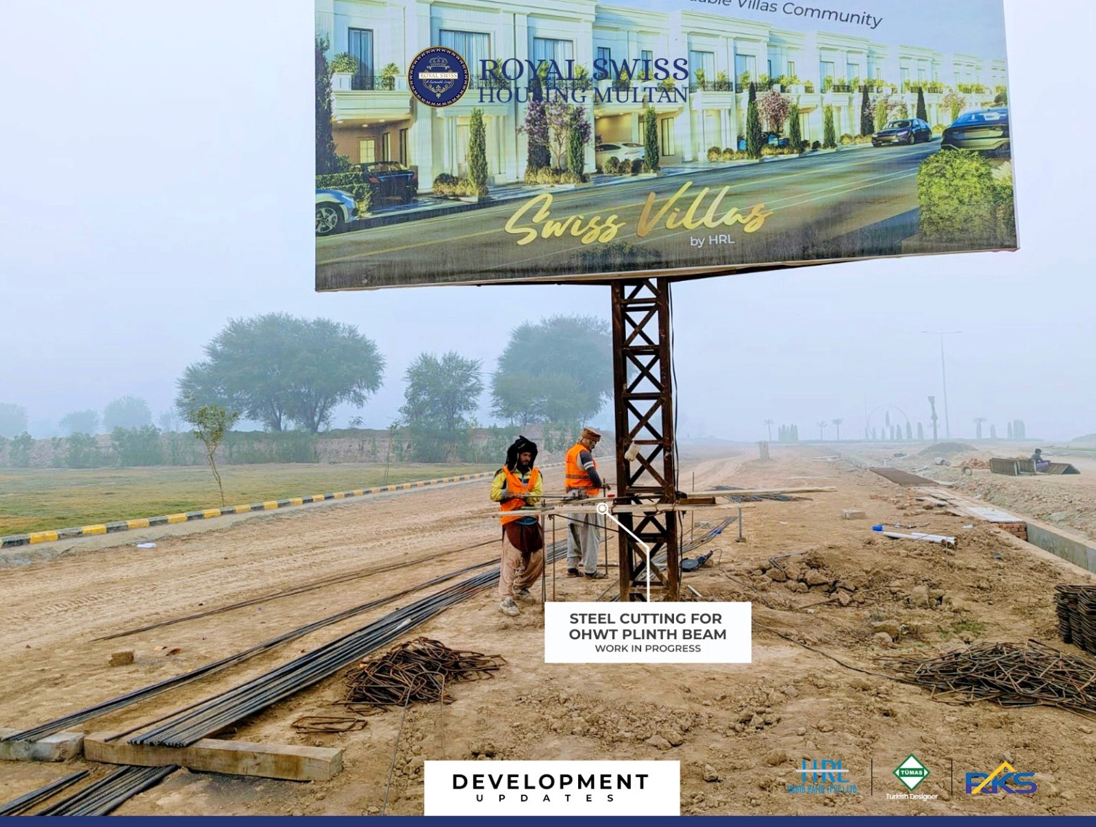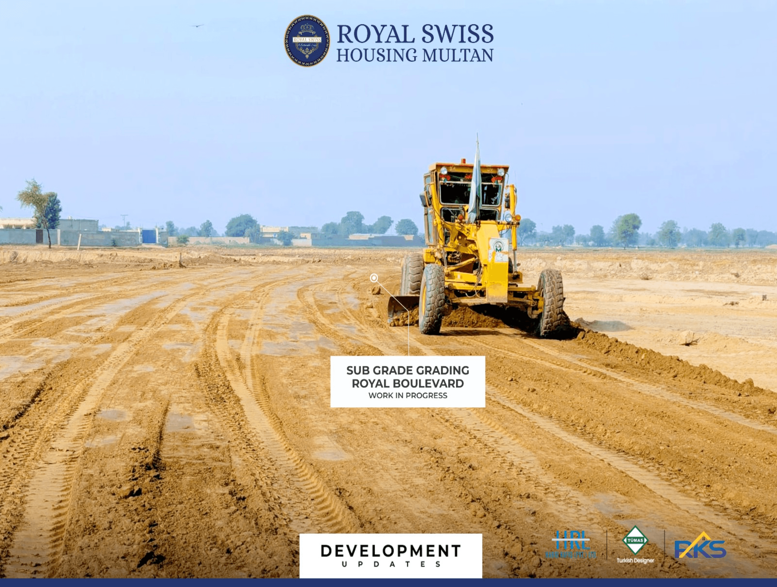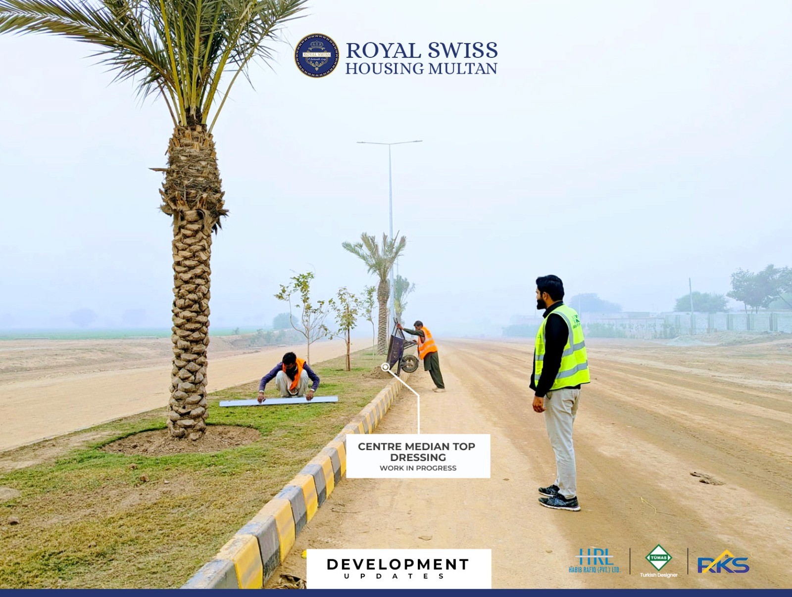 Centre median top dressing and landscaping works are underway along the Main Boulevard, enhancing visual appeal and road hierarchy. This phase contributes to a well-defined, green, and organized streetscape within Royal Swiss Housing Multan.