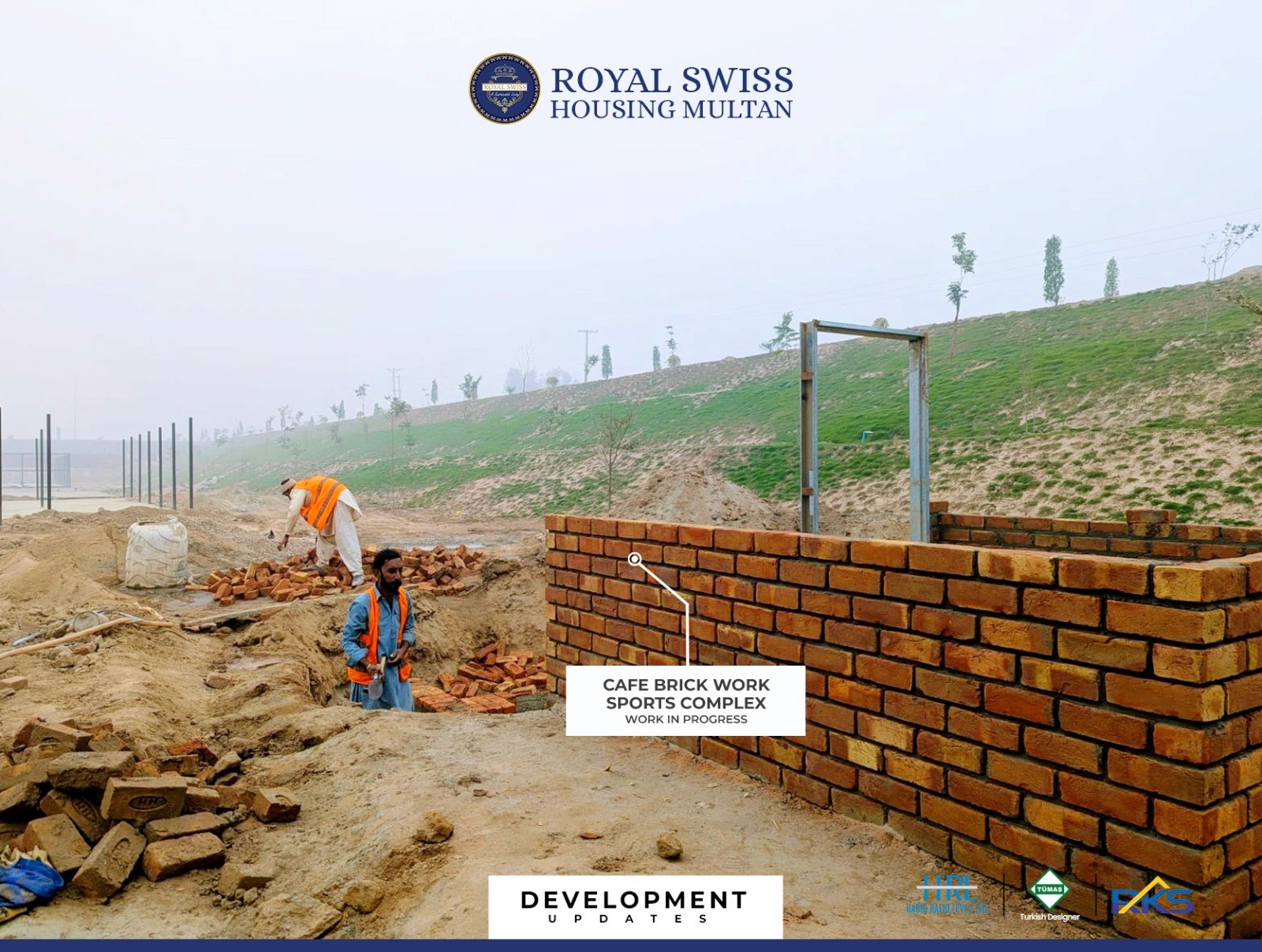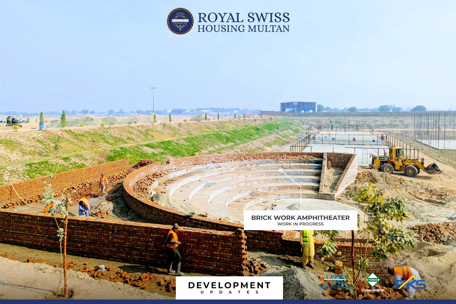 Brickwork construction is actively underway at the Amphitheater, shaping the stepped seating structure with precision and strength. This milestone marks significant progress toward creating a world-class recreational and cultural venue within Royal Swiss Housing Multan.
