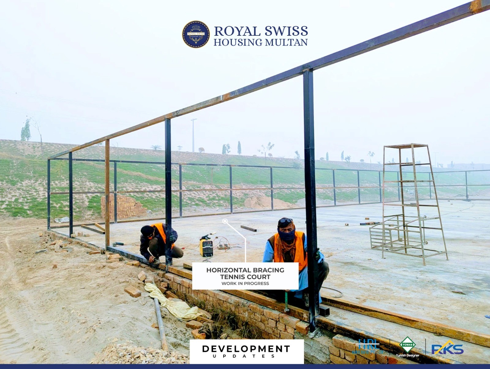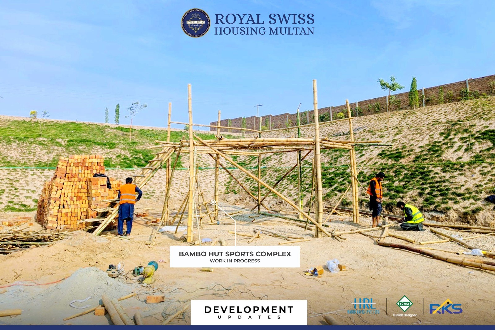 Construction activities are progressing across the Sports Complex, including café brickwork, tennis court structural bracing, and bamboo hut development. These works reflect steady advancement toward creating well-integrated recreational facilities with a balance of functionality and leisure-focused design.