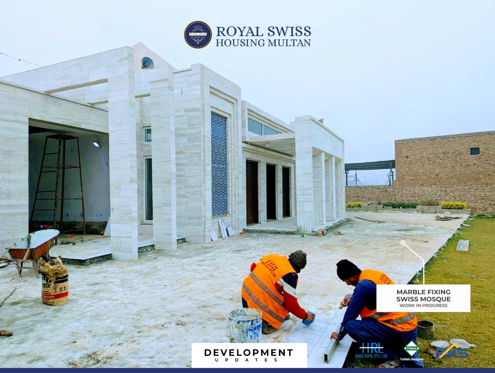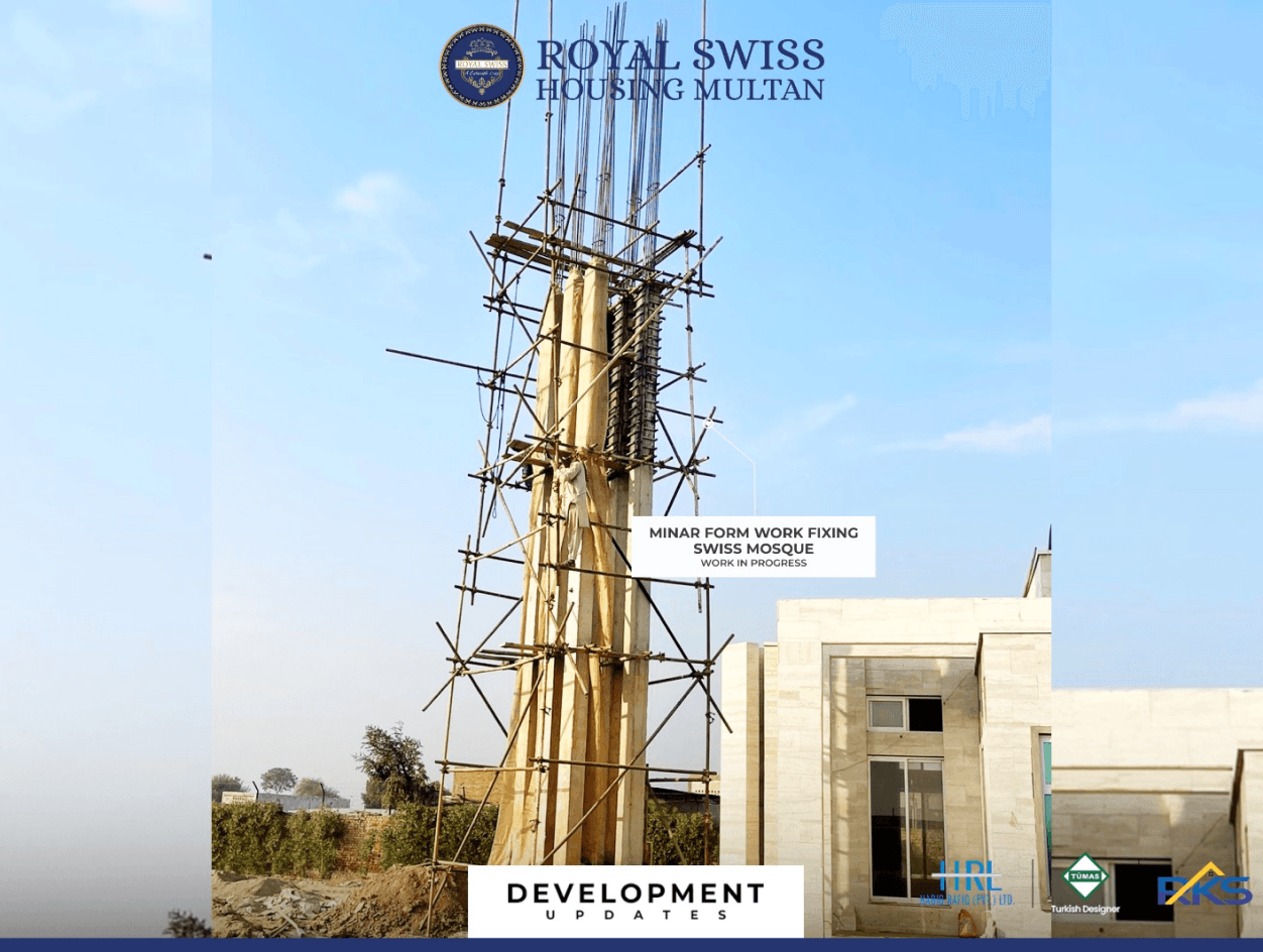 Marble flooring and fixing works are in progress alongside minar formwork installation at the Swiss Mosque, reflecting steady advancement across architectural and structural elements. These developments highlight HRL’s commitment to precision craftsmanship, durability, and timeless design excellence.