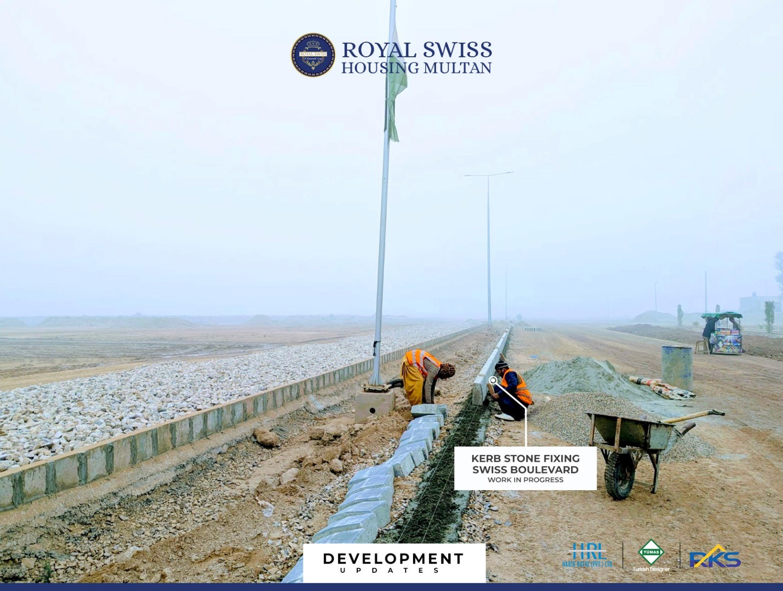 Kerb stone fixing, drainage installation, and sub-grade grading works are actively underway along the Main Boulevard, strengthening the road’s structural and drainage framework. These coordinated efforts ensure durability, proper water management, and a high-standard boulevard network for Royal Swiss Housing Multan.